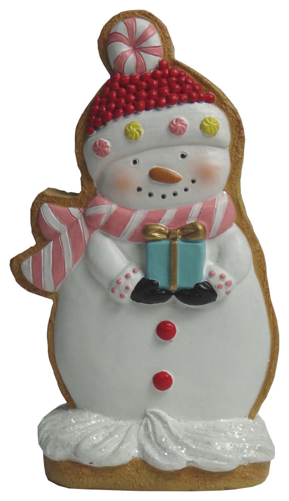 This Snowman cookie is a perfect accent piece for your dessert table. Designed like a gingerbread cookie this happy snowman is winter ready wearing a striped pink and white scarf. He is accented with a pink and yellow candy. He is holding a beautifully wrapped present. When planning your next Christmas party be sure to add this Reindeer cookie to your dessert tables. Product Features: