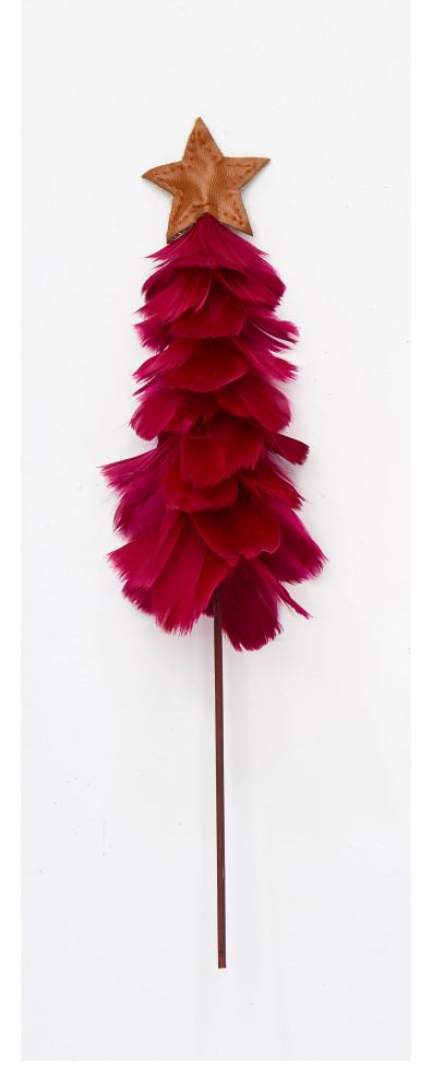 Add a pretty touch to your holiday arrangements with this feather tree on a wood stick. The tree is made of bright burgundy real feathers detailed with a start on top. Perfect addition to any floral holiday decoration.
