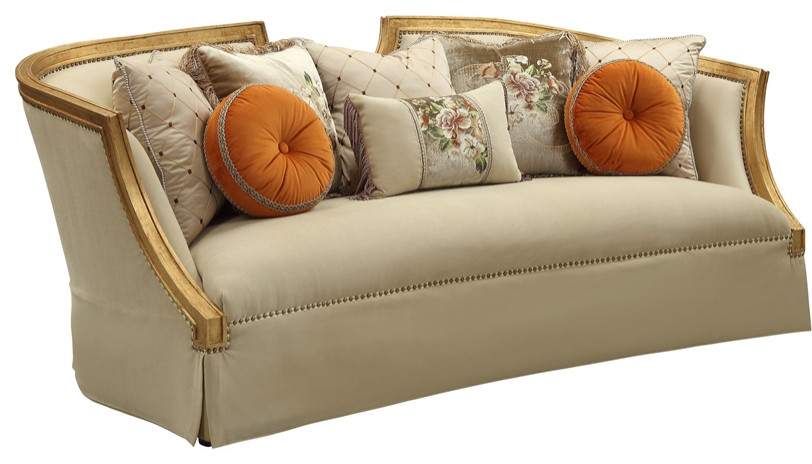 Crafted with a penchant for Old World artistry and French Provincial inspired, the Daesha sofa is the perfect addition for traditional living rooms. Balancing comfort and style, this shapely barrel back sofa features an elegant bone upholstered seat back and cushion with sloped arms. The carved molding and nail head accented trim in antique gold finish heighten its classical appeal. A pleat skirt and eight accent pillows in coordinating colors and patterns add comfort and visual appeal. An updated rendition of a classic piece, this beautiful sofa is perfectly suited for any room décor. Material:Fabric, Wood Leg (Poplar), Frame: Hardwood