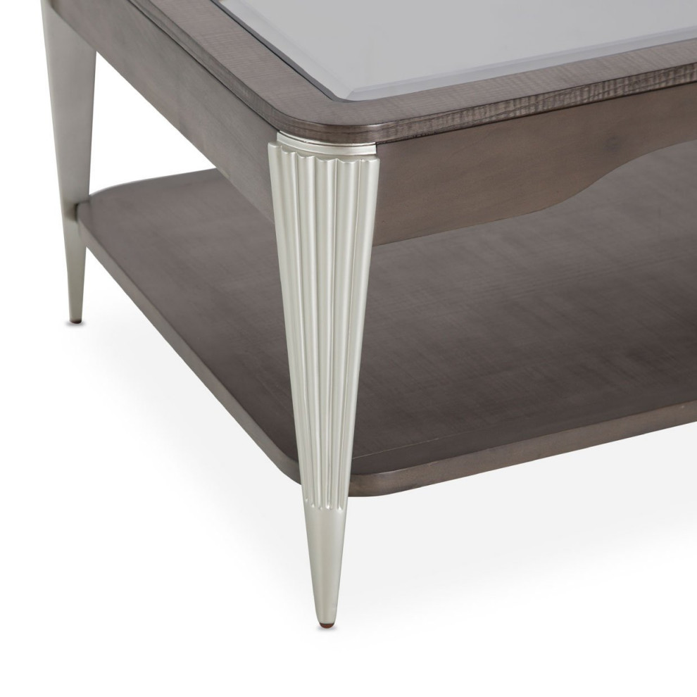 DescriptionA classic piece with a modern touch, The Roxbury Park Cocktail Table brings smoky slate tones, pops of platinum, and beveled glass touches to your living room style.