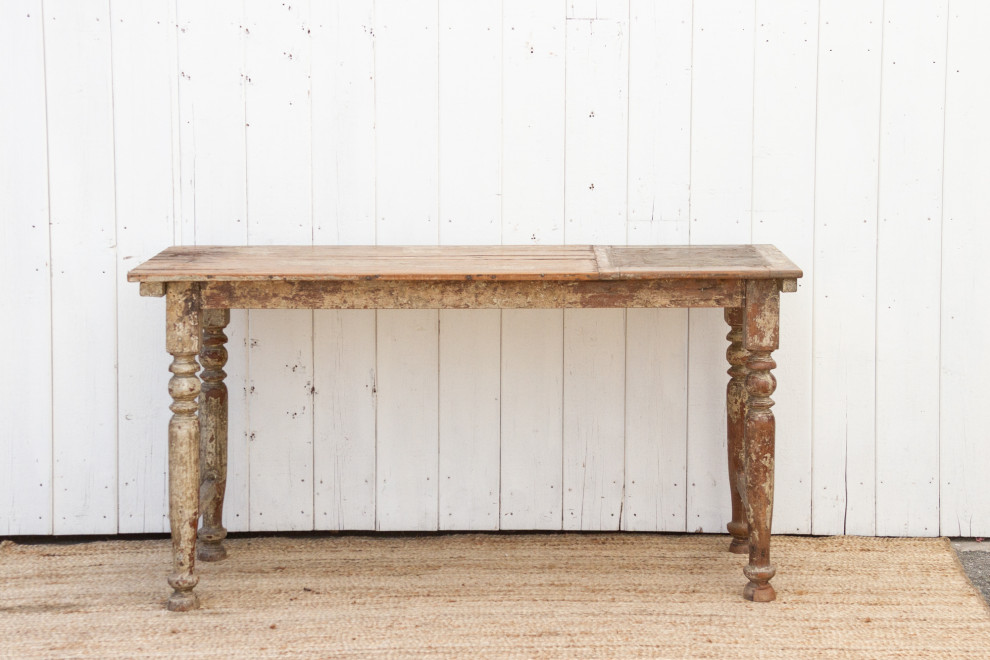 This antique English country kitchen table exudes rustic charm with its charming rounded legs and beautifully aged painted finish. The table showcases a semi-oxidized color and raised grain, adding to its unique character. An ideal addition to farmhouse or bohemian decor, this antique rustic console will effortlessly elevate your space with its timeless appeal.
