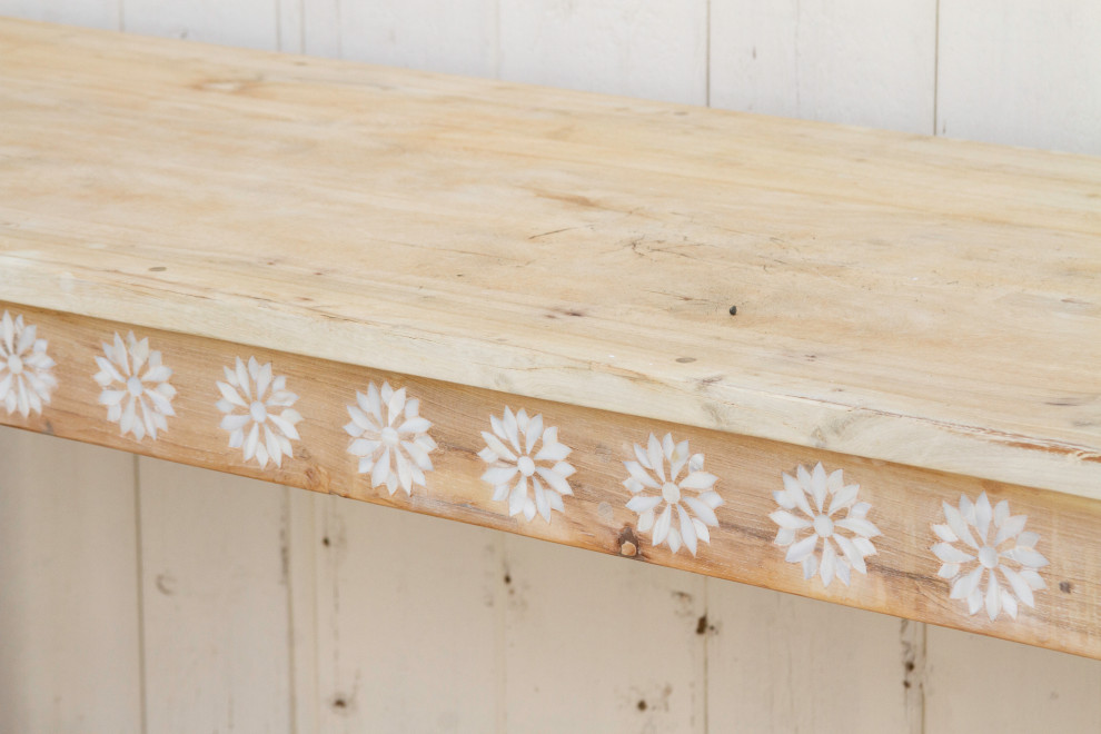 A charming console table with thick square legs and a lower shelf. Made from reclaimed teak, this large reconstructed table has natural reclaimed teak finish with a beautiful inlay work in a floral motif. This table features blossom inlay designs across all the apron on all sides of the table. This table has four square legs and lower shelf. Our blossom mother of pearl inlay collection is inspired by the opening of a lotus flower which is a symbol of purity and enlightenment. This reclaimed teak table is hand-carved forming the flower shape, the inlay pieces are cut and carefully hammered into the wood to create the lovely lotus design.