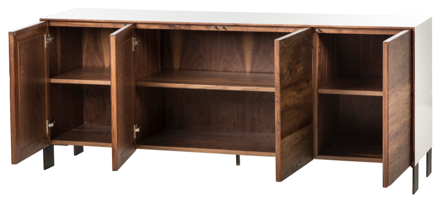 This media console is the perfect combination of classic and contemporary. Graphic steel legs and a sleek, snow-white lacquer case provide a beautiful textural contrast to the rich, earthy tones of reclaimed Brazilian peroba solids door fronts, which have been naturally weathered by decades of sun and rain, adding a sense of history and timelessness to this piece. Three sets of doors reveal double shelving storage within.