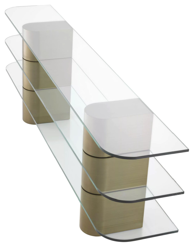 A console table that exudes luxurious simplicity, Lunden by Eichholtz three layers of clear glass shelves supported by brushed brass pillars. This console table gives the interior an elegant touch that never goes out of style.