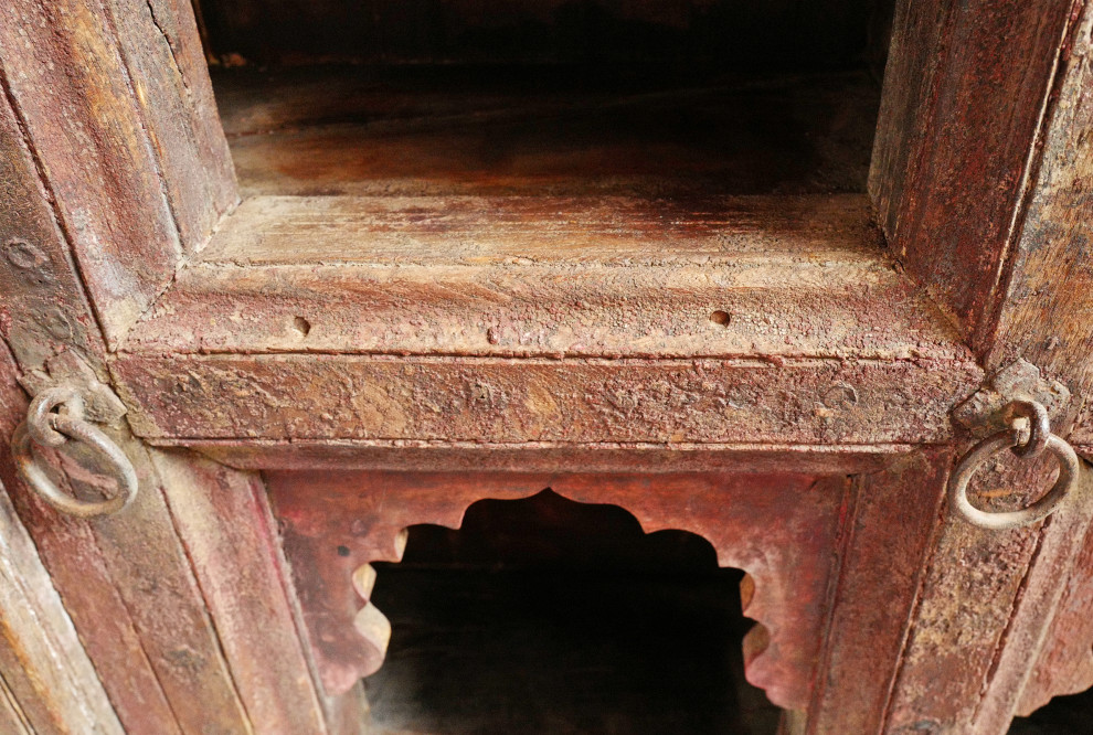 Consigned one of a kind antique carved wood Jodhpur temple cubby style shelving unit. Beautiful traditional India carved details and original brass rings. Authentic old patina and signs of age and use.