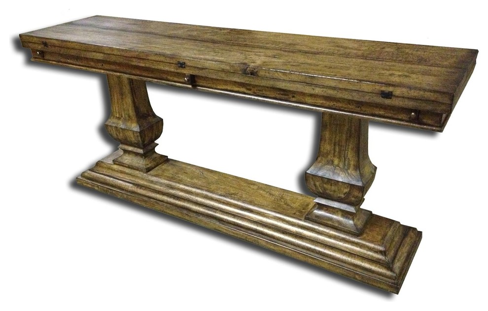 Item #:BG-401Overall measurements (inches)30H x 72W x 18DOpen 36D .Indulge your inner Italian with this fabulous new Sedona console table in the Tuscan style! Crafted with a solid wood construction, the new console table has Old World appeal with its skillfully applied distressing and rustic pecan finish. The table has a fold out top which makes it a very versatile piece of furniture indeed, whether you use it in your hallway or in your living room. Or perhaps you will enjoy it in your dining room or home bar area so it can be folded to the narrow top when not in use, but quickly opened out when guests arrive to provide extra serving space. Decorative hinges add to the attractive look of this fine new console table with chunky and shapely pillar legs. The console table is designed in the Italian Tuscan style and anyone might believe that it was found in an old house among the vineyards in Italy!Overall Condition is New. Style:Tuscan.Dates to circaNew.