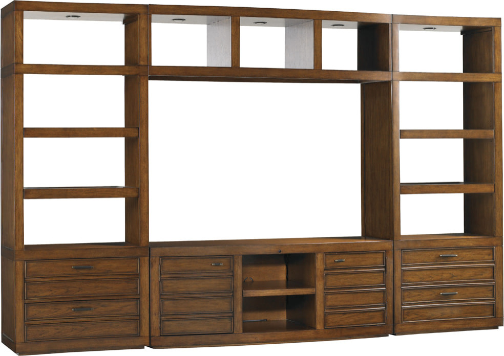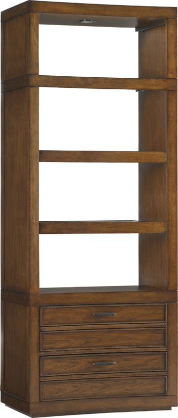 Crafted from Hickory veneers, designs feature a distinctive horizontal motif, metal accents and custom hardware. The look is fresh and modern, with a bit of an edge. Unique silhouettes will transform any office or media room into a statement of personal style.