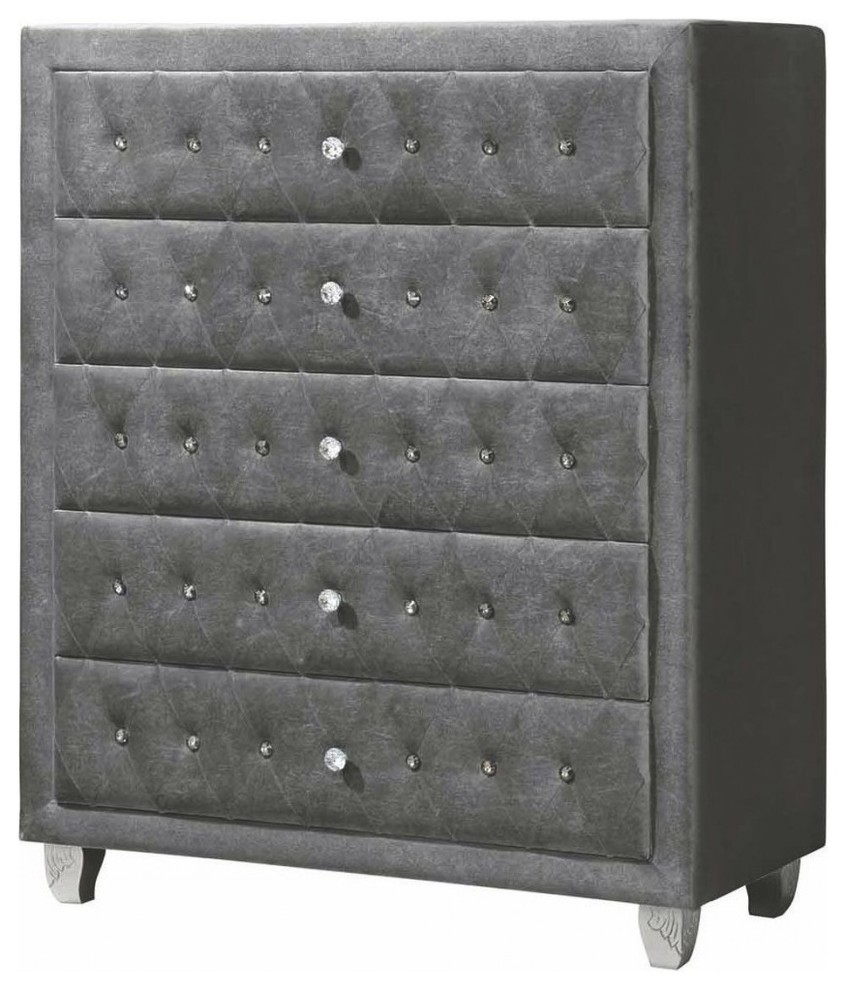 An elegant and breathtaking collection, our Diana collection's full upholstery will make you feel like royalty. Our Diana Upholstered 5 Drawer Chest is crafted of hardwood solids and sits on carved legs in a metallic silver finish. The properly tufted upholstered chest features faceted button nailhead trim felt lining in the top drawer. Pair this chest with the rest of our Diana collection to complete your bedroom.