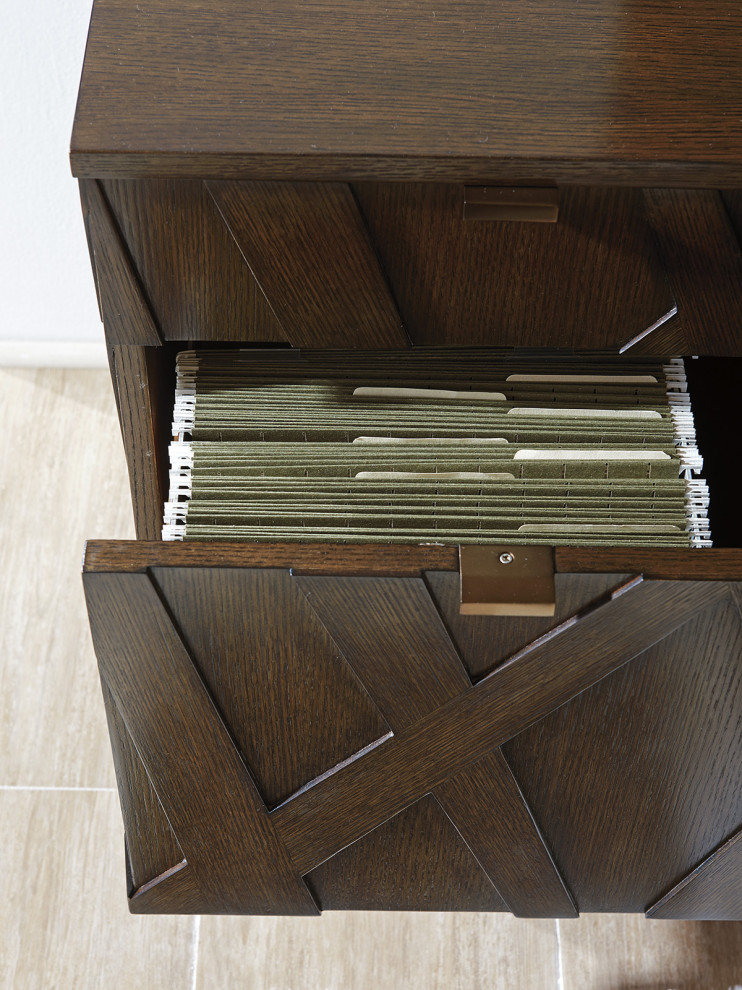 Crafted from quartered white oak veneers in a rich mocha coloration, Cross Effect offers an innovative fusion of contemporary and industrial design, featuring striking metal bases, decorative accents and custom hardware in a bronze-finished silver leaf. Asymmetrical styling offers a slight urban edge to the look, enhancing its modern aesthetic and sophisticated appeal.
