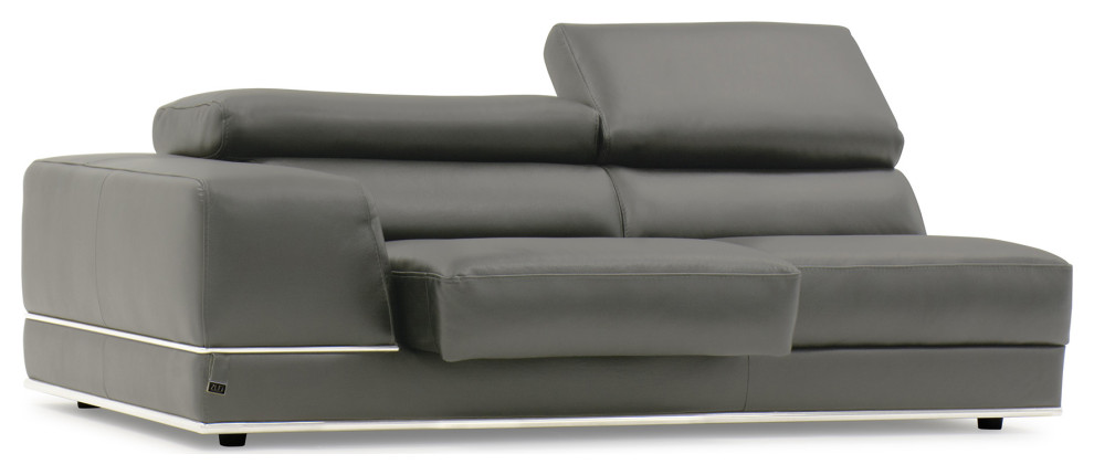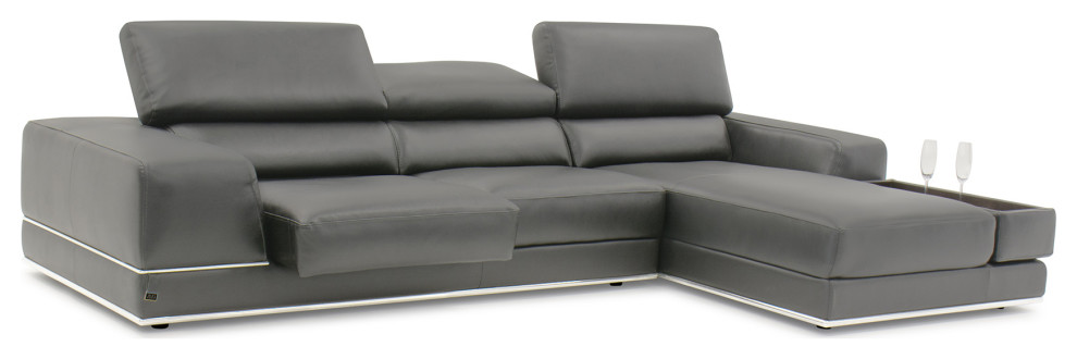 Our popular Wynn sectional is now available in a smaller size! Introducing the Encore. Elegant and metropolitan, the Encore sectional in slate top grain leather with real split leather back and sides will be a bold statement piece you'll own for many years to come. The sleek and modular design lets you personally customize any configuration to fit beautifully in your home. Adjustable headrests, extra-wide armrests, and a reversible dining tray/armrest give this piece the ultimate in function and sophistication. The end seat slides forward to extend an extra six inches in depth for unsurpassed comfort. Available in stock colors of black, white, or gray. Custom orders feature approximately 29 colors and additional pieces to customize the length of the sectional to fit into any space. Color swatches are available. Please contact the showroom for more information.