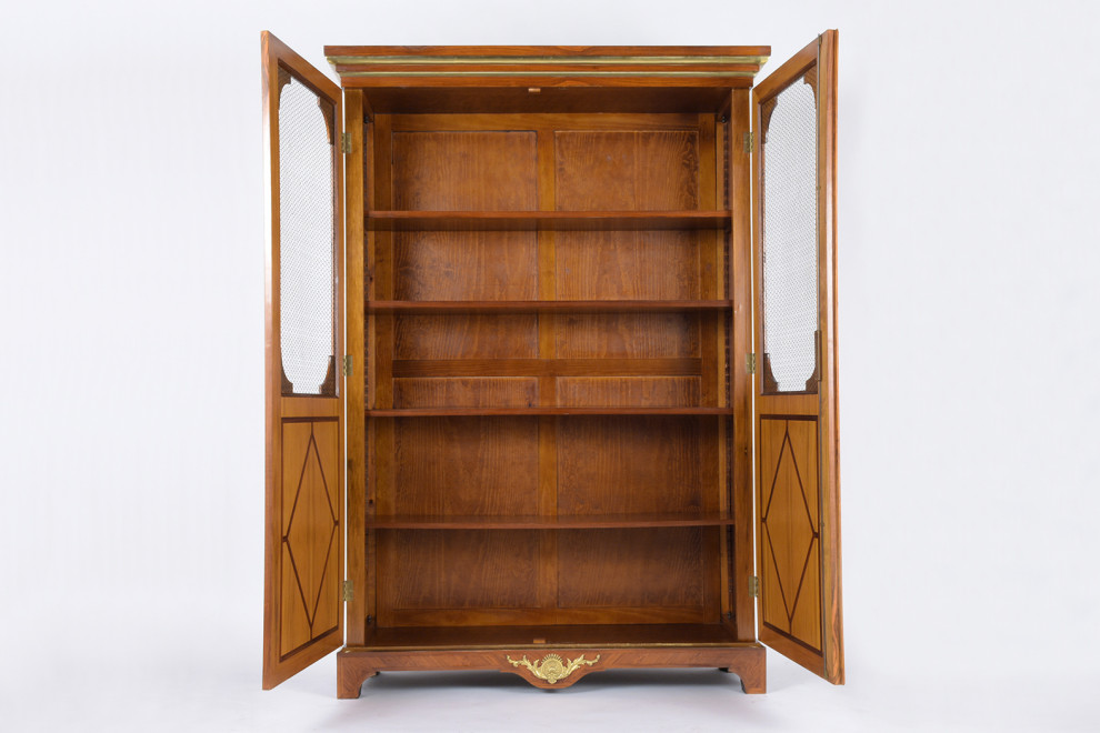 A fabulous Antique French Louis XVI style bookcase is hand-crafted out of walnut wood has been professionally restored and is in great condition. This 1890's Bookcase features a remarkable marquetry design throughout the entire piece along with a flat brass molding on top-bottom, its original light maple color, and newly lacquered finish. This wardrobe also comes with double doors, the upper top of the doors have a chicken wire mesh, has beautiful marquetry paneling framed in a brass molding on the bottom, and has the original lock and key in working condition. The interior features four adjustable shelves giving the bookcase plenty of storage space. This Late 19th Century Marquetry Wardrobe is a unique handcrafted piece that is ready to be used for years to come.
