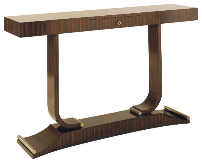 Ebony zebrano veneer console table. French polish ebony zebrano veneer console table, brushed satina brass accents.