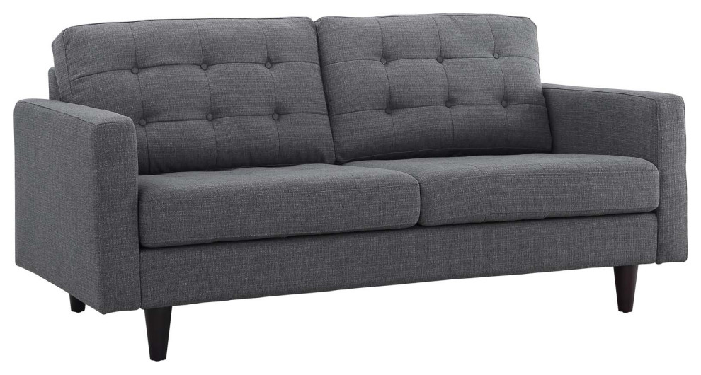 End the rule of unjust sovereignties that wage a useless war for your interiors. Empress Button Tufted Upholstered Fabric Sectional Sofa Set leaves the would-be heiress of holistic furnishings in the dust with a design that rivals any competitor. Empress is a 3 piece loveseat and armchair set heralded with deeply tufted buttons, plush cushions, and armrests that convey that perfect air of nobility. The solid wood legs come with plastic glides to prevent floor scratching, and support the solidly constructed wood frame of this sectional sofa set. Dense foam padding create a luxe seating experience while the durable and stain-resistant fine fabric upholstery leaves the recipients feeling richly rewarded. Set Includes: One - Empress Upholstered Armchair One - Empress Upholstered Loveseat One - Empress Upholstered Sofa
