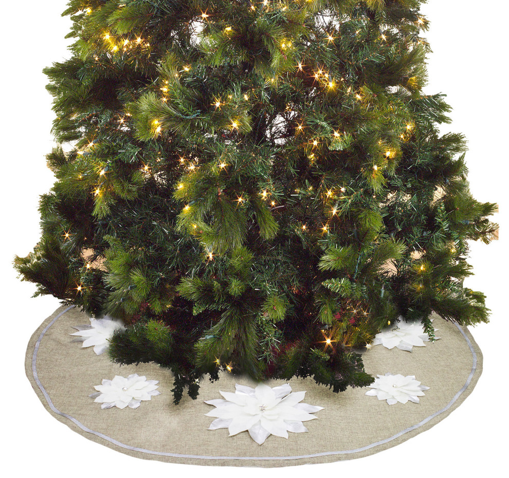 3D Poinsettia design Christmas tree skirt will dress up your tree and bring charm to your decoration. It will give any room a touch of elegance. Features a festive poinsettia made of felt and leatherette, each flower decorated with bells. Button closure.