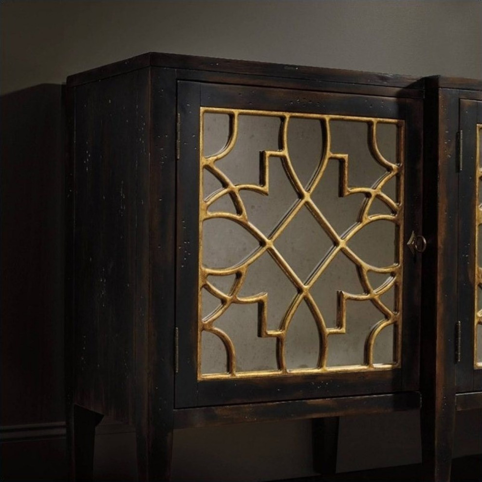 Give your home a jolt of energy with this feel-good, exquisitely-styled four-door console adorned with antique mirror and gold leaf fretwork and finished in a contrasting Ebony, a hand-rubbed black providing drama and contrast. Pursue serenity at home...Create your own personal sanctuary, a special place where you can experience...comfort within. Distressing includes chopping, wormholes and rub-through.