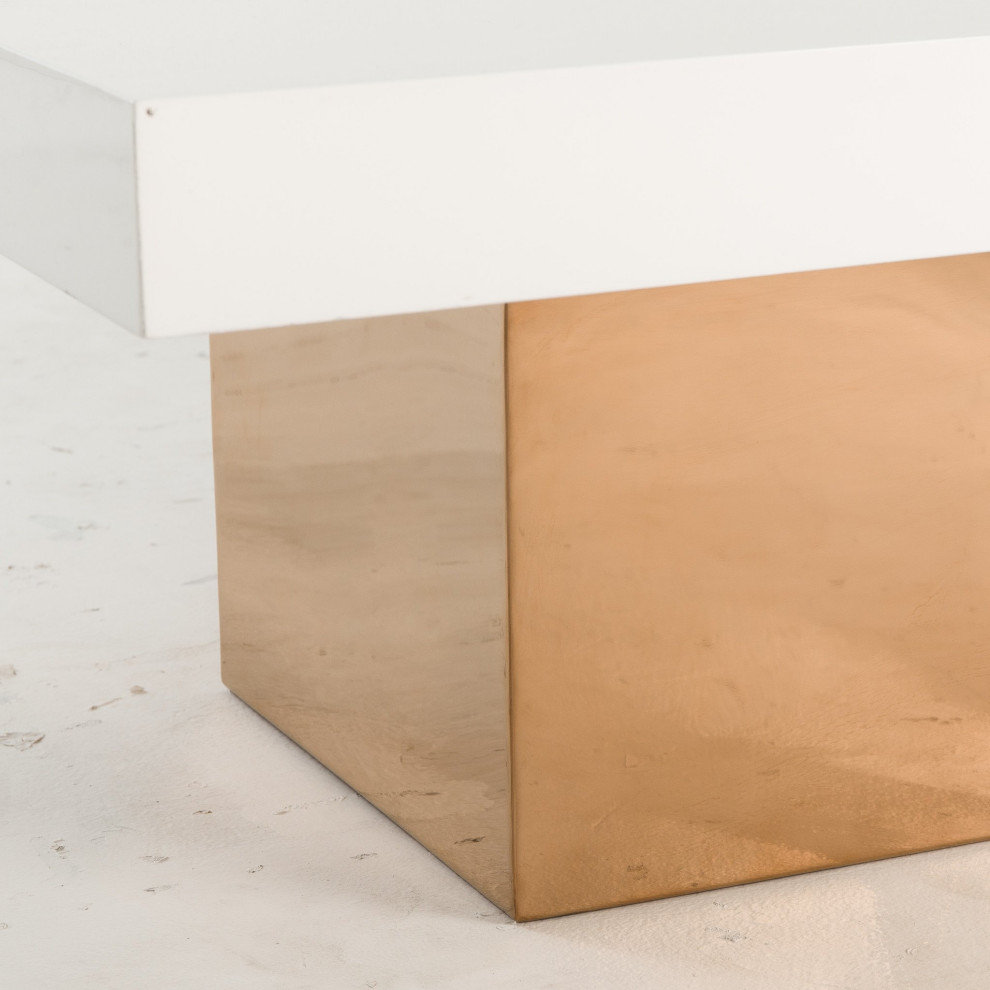 Available in square and rectangle iterations, this coffee table maintains the perfect balance of bold forms and mixed materials. Combining a stainless steel plinth base finished in mirrored brass, and contrasting snow white lacquer top; stainless steel band detailing in mirrored brass, spliced at different lengths, create visual interest. This piece will suit contemporary style living spaces.