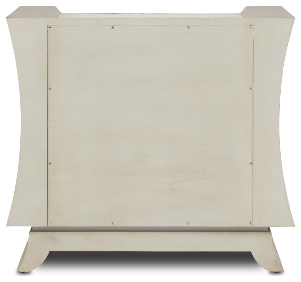 The Koji Nightstand, designed by Barry Goralnick, has a serene presence with its curved sides and feet that emulate calligraphy shapes found in Asian characters. The drawers and inset top are covered in cream faux shagreen, while the beechwood surrounding them pleasantly contrasts in an oyster gray finish. The squared-edged brass pulls have a brushed brass finish to add character to the rectilinear elements. The drawers on the gray nightstand are large: the ample size perfect for any bedside needs.
