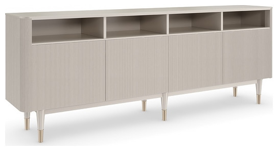 Use as an entertainment piece or a buffet, the front and sides are encased in the reeded details like the other items in this collection. Open cubby spaces offer easy storage access above a four door interior. Behind each door the interior offers adjustable shelves and access holes to the back for easy cord management. Frame finished in Matte Pearl and ferrules in Whisper of Gold.