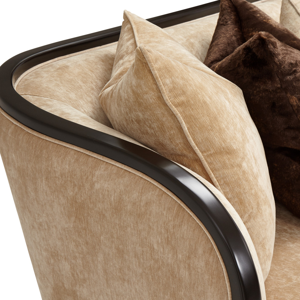 Design your home for romance. The Malibu Crest Sofa features an exquisitely curved body with cascading arms finished in Dark Espresso, and a softly textured seat to brighten your home atmosphere instantly!