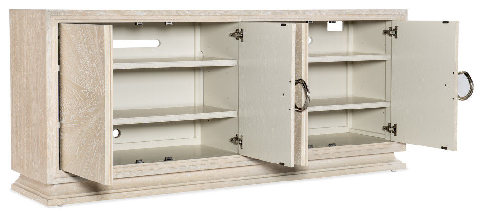 A brilliant fusion of classic architectural elements, movement of soft angles and a serene Sandstone finish on Cathedral and Quartered Oak Veneers, the Nouveau Chic Entertainment Console pairs calm chic style with function. Accommodating up to an 80 inch TV, the console has 4 doors with soft-close hinges and magnetic door catches with two adjustable wood shelves behind each pair of doors. Includes a 3-plug outlet behind the right-side doors and a ventilated back panel.