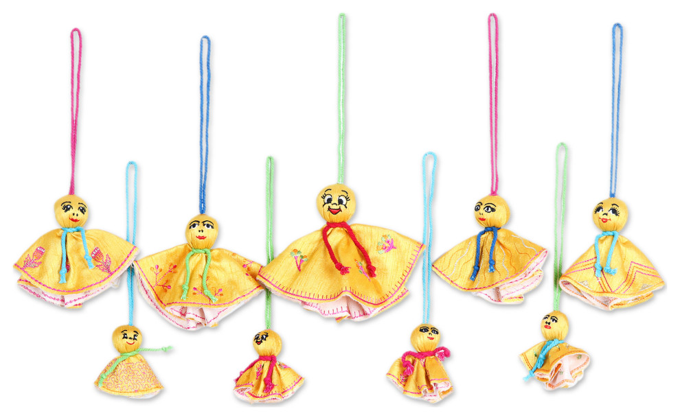 Bright and merry, this set of nine yellow doll ornaments will fill your Christmas tree with the festive spirit. Hand-crafted from viscose, the vivid ornaments feature three different sizes, rayon and zari yarn embroidery, polyfill for the heads, cotton cords for decoration and hanging from the tree as well as a polyester pouch for storage. These accessories presented by Asha Prabha are known as i Chekutty i dolls in India and became a symbol of the state of Kerala's resilience after the floods of 2018.