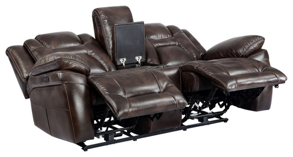 Start your engines with the Dual-Power Oportuna motion group. Abundant padding for comfort and top-stitching detail for style, this Console Loveseat will be the focal point of your room. Upholstered in a a durable rich brown faux leather with a center console that features hidden storage for remotes and other small items plus two cup holders to keep drinks handy. Keep your devices charged with the convenient USB charging ports located in side the console and also on the control panel on each side.