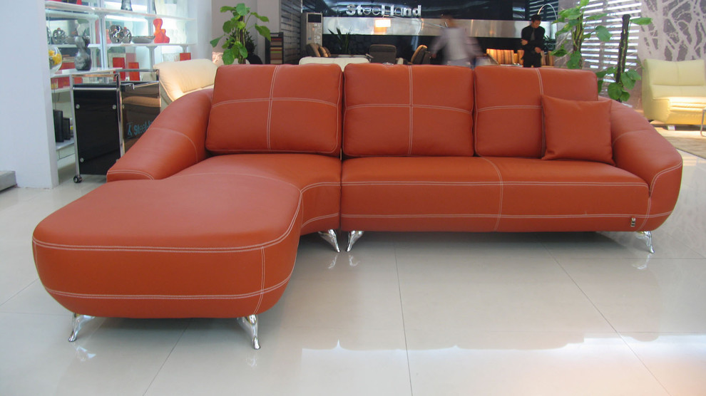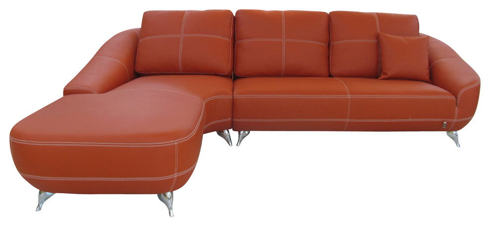 A fabulous balance of contemporary and retro styling, our Lucy sectional delivers social poise and grace in refined abundance. Soft high density foam seating combines with premium contrast off-white double top-stitching and genuine top grain Italian leather, creating an indulgent retreat. The rich, burnt orange color will warm any living room up with legendary results. Top it off with sculptural chrome legs and a swiveling accent chair and you have a spectacular piece that is sure to turn everyone's heads! Includes one matching throw pillow.