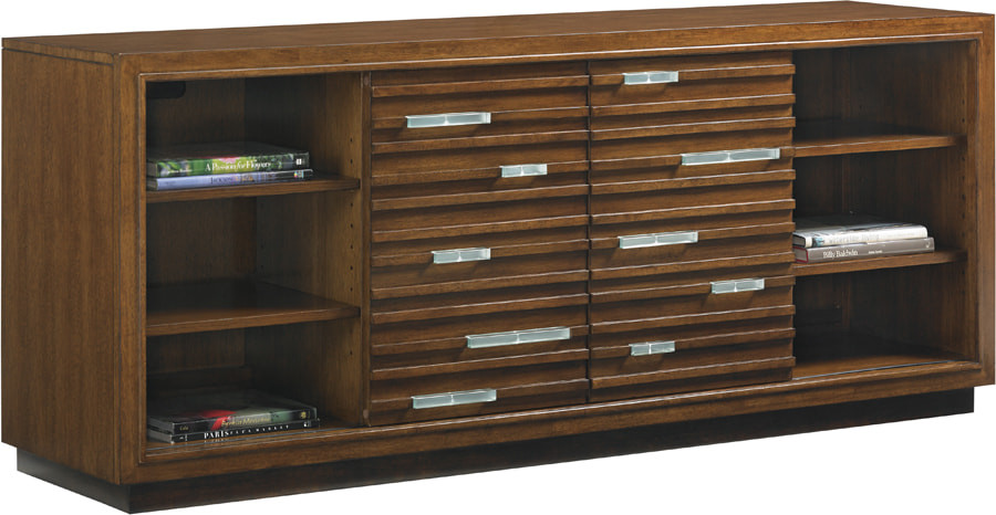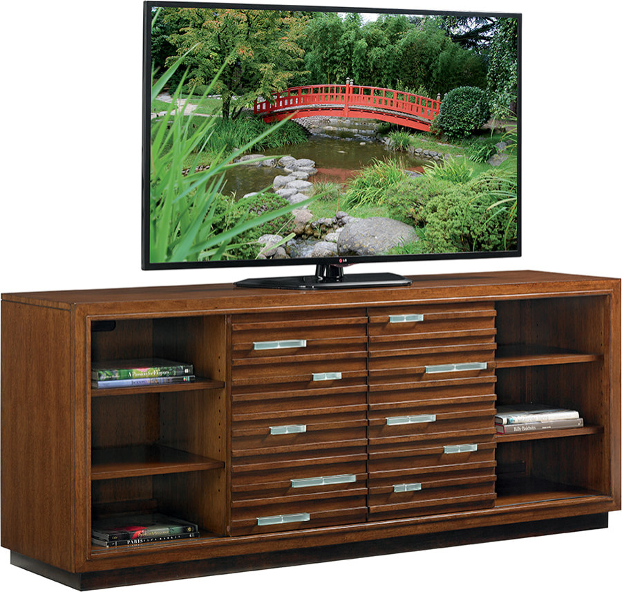 - Pan-Asian Design Is at the Center of This Media Console. Two Sliding Glass Doors Feature Decorative Glass Accents That Create an Interesting Play on Materials. Fully Functional, The Console Has Three Adjustable Shelves. Behind Left, Right Side Facing Doors. the Center Has Six Adjustable Shelves, Ventilation, Grommets for Electrical Cords. It Can Accommodate the Sligh Strong, Arm.