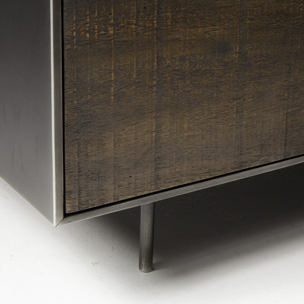 Rebecca epitomizes modern simplicity. This chest features a cold-rolled steel frame and turned legs finished in a striking ebonized black coloration, which contrasts beautifully with three deep drawer fronts, handcrafted from reclaimed Brazilian Walnut, finished in a raw, textured patina that showcases the natural grain and distressing of the wood.