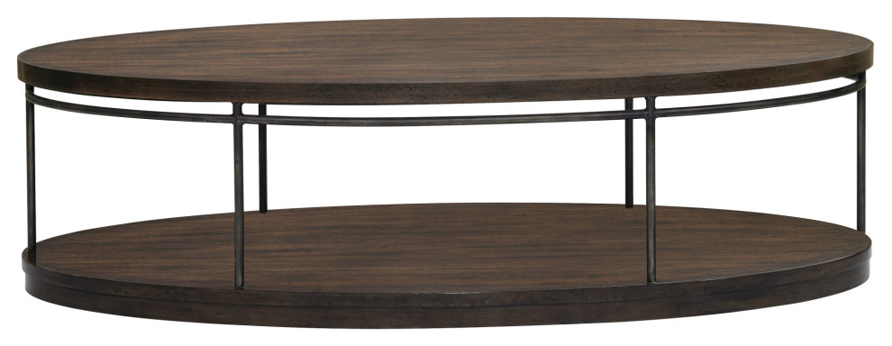 All furniture purchases are final. If furniture arrives damaged or is defective please call for assistance (800) 375-3403. Furniture Return Policy. Features: Features an oval-shaped cocktail table with an open shelf at bottom for storage or to display home décor Constructed of rubberwood, MDF, and metal for durability and stability This product is covered for manufacturer defects only Product requires minor assembly Dimensions: Height: 17" Width: 22" Length: 60"