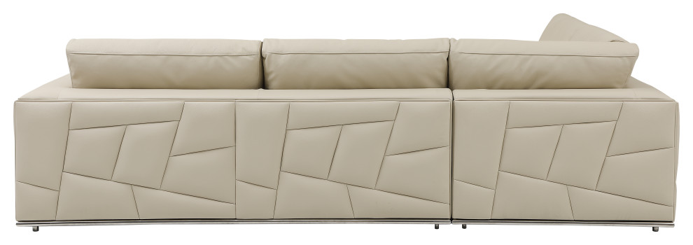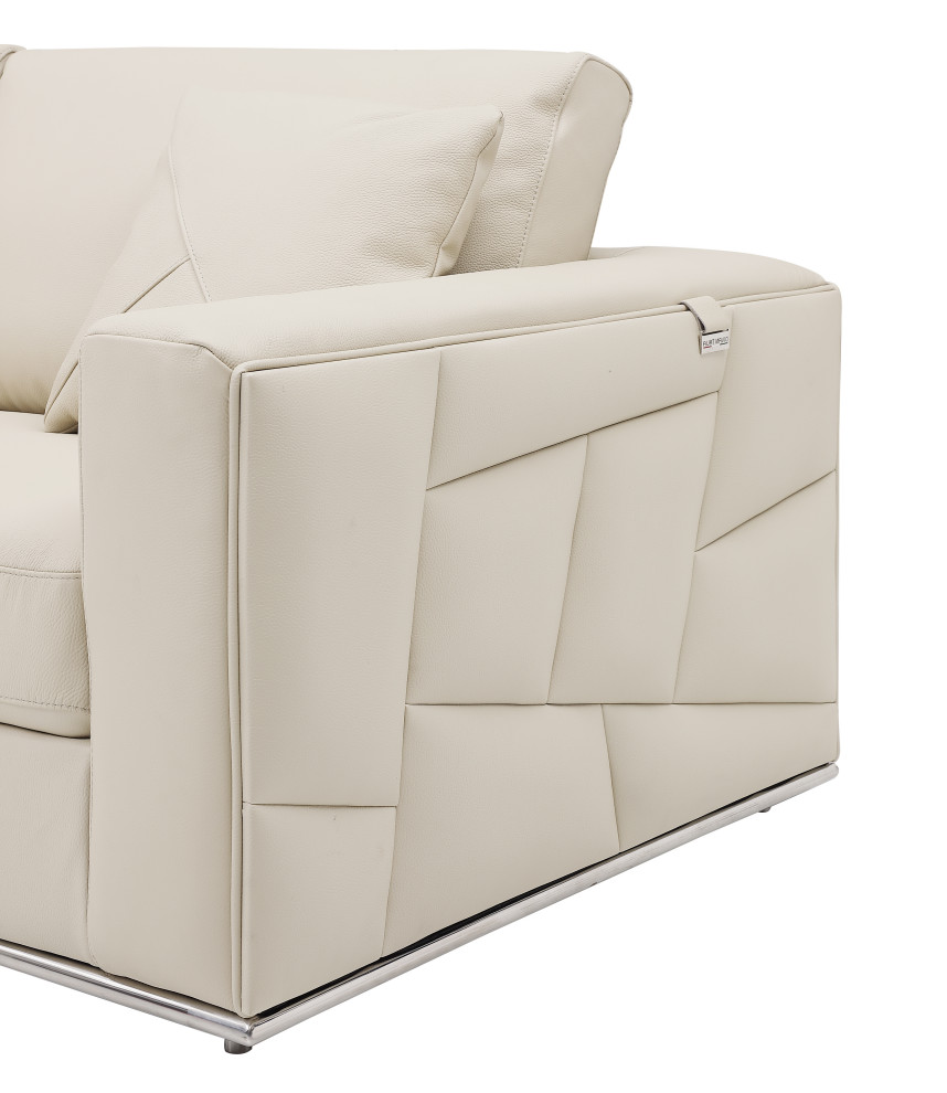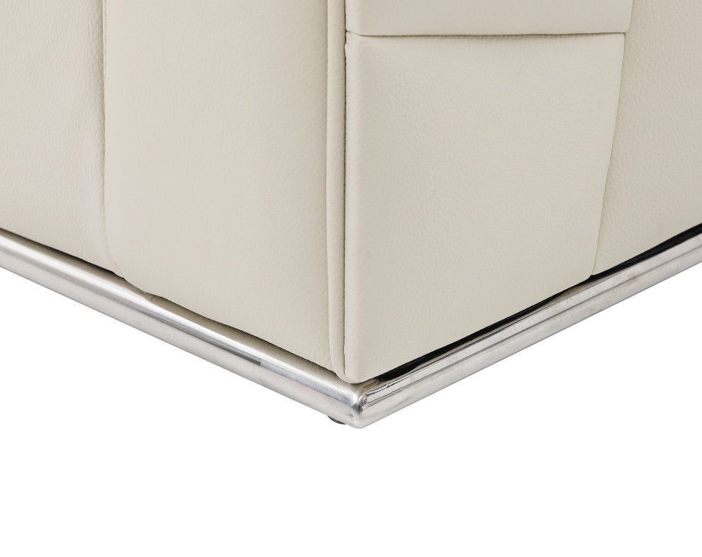 Compelling in its simple yet cutting edge style, the Skylar collection is a bold take on contemporary design. The sleek, low-profile frame is met with grand cloud-like seat cushions to create the statement making structure. Covered with Top-Grain Italian Leather in a beautiful cream color that continues that modern, sleek design. The Skylar sectional also balances the expansive seating with unprecedented craftsmanship. Grounded on stainless steel base with an elegant chrome finish, this piece is thoughtful composition demonstrates an exceptional opportunity for modern luxury in your home