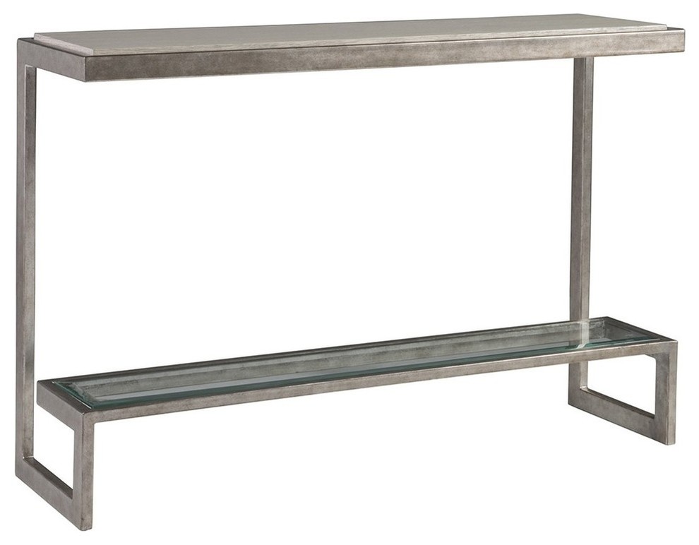Contemporary design crafted from antiqued silver leaf finished metal base, inset tempered glass shelf, and inset quartered white oak top in a wire brushed light gray finish.