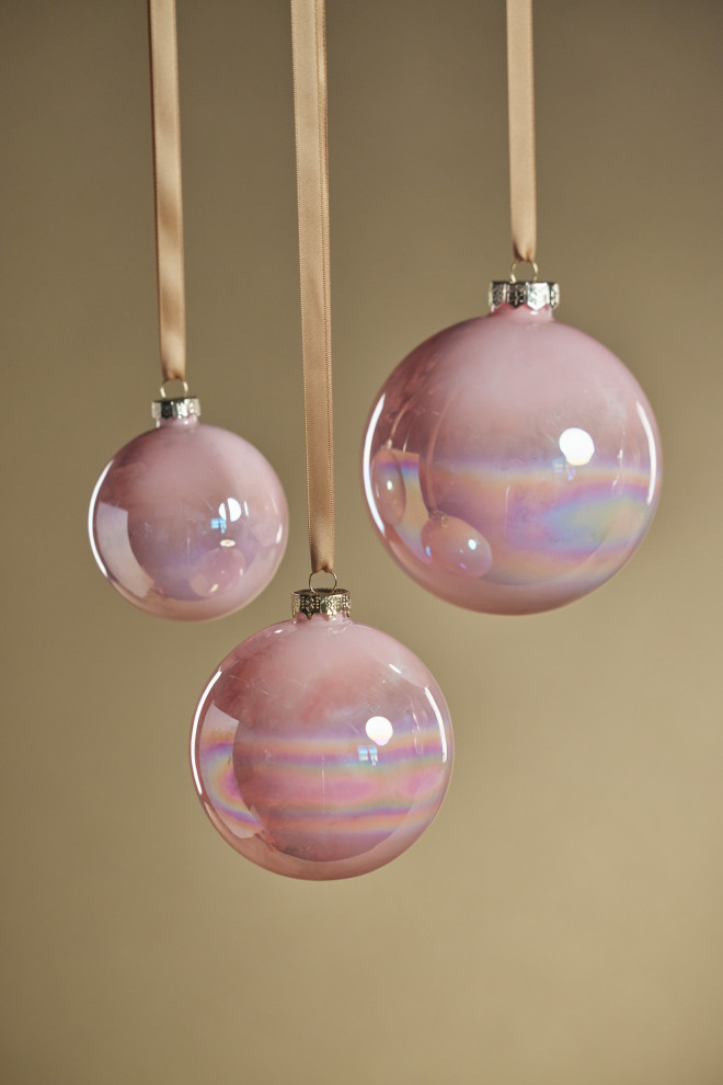 This elegant piece is amazing for any holiday decor. Fully dimensional ornament that has a shiny and glossy finish, giving it a polished and refined appearance. The luster effect enhances the overall visual appeal, making the ornaments stand out and catch the light beautifully. A small cap with metal ring is attached to each round glass decoration for easy hanging on trees, garlands, and wire.