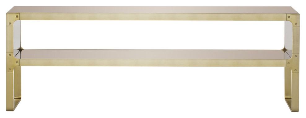• A contemporary, stainless steel media console, finished in satin brass, with bronze glass top, sides and shelf conveys relaxed glamor.