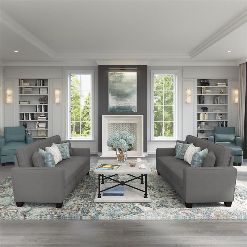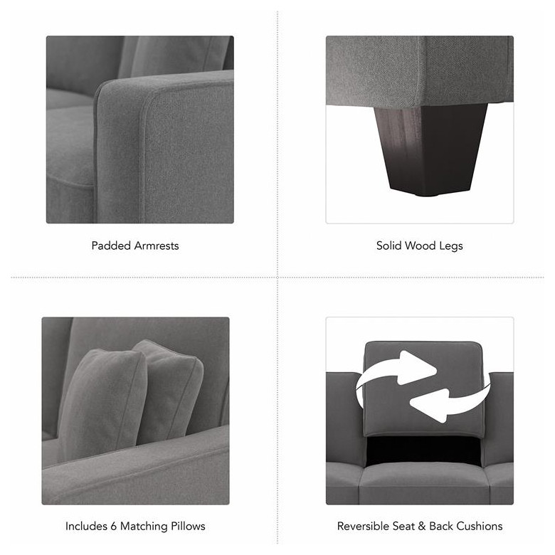 The Bush Furniture Stockton 135W U Shaped Sectional Couch presents a practical living room seating solution with remarkable quality and durability to match its casual style. Conveniently packaged for easy movement into any room or corridor, this ready-to-assemble U shaped couch is great for furnishing everything from a large home to a small apartment. Enjoy the company of friends and family or relax by yourself on a sectional sofa with high-density foam cushioning and pocket coil seat springs that maintain their feel for years of comfort. Reversible cushions feature pet-friendly StainGard(TM) fabric that repels dirt, oil, water and other liquids to prevent blemishes. The framework has a quiet sinuous spring design with cross supports that won't sag over time. This living room sofa has been rigorously tested for safety, durability and stain resistance and is backed by a 1 Year Warranty.