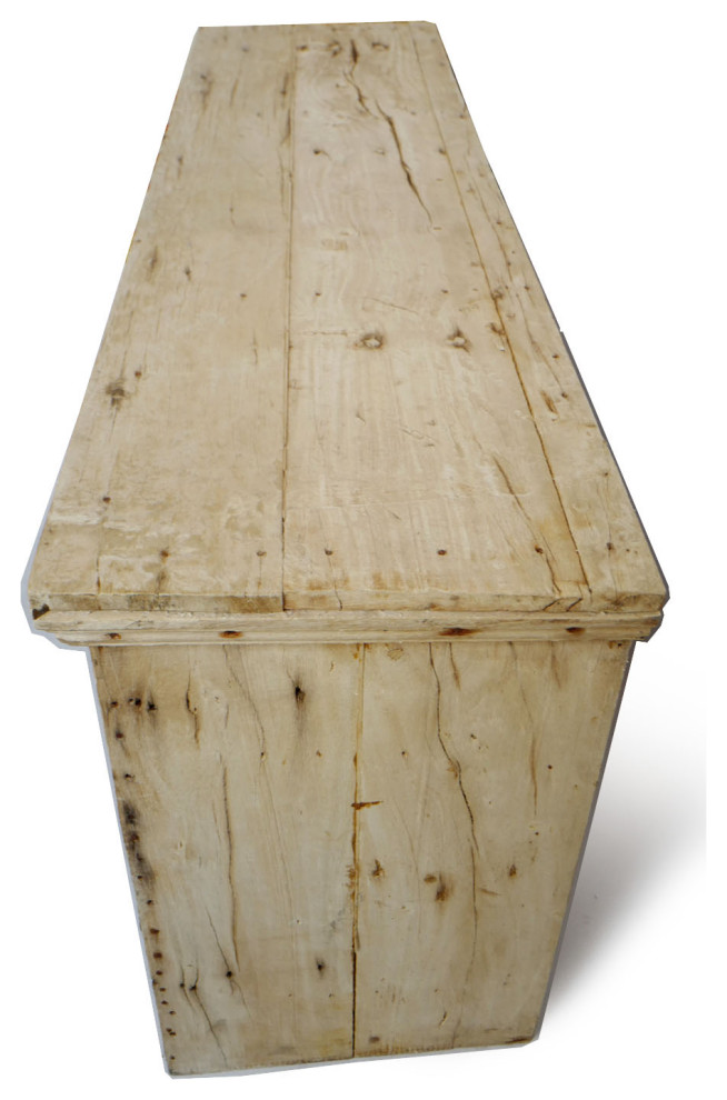 Beautiful sun bleached console, entry or hall table. Each original repurposed from old doors found in northern India with unique aged iron bracket details, nail heads, iron ring and/or chain details. Sanded smooth with raw bleach wood. Great texture with natural imperfections, age, and character. Great also used as a unique plasma TV stand. This piece is a table only and does not open.