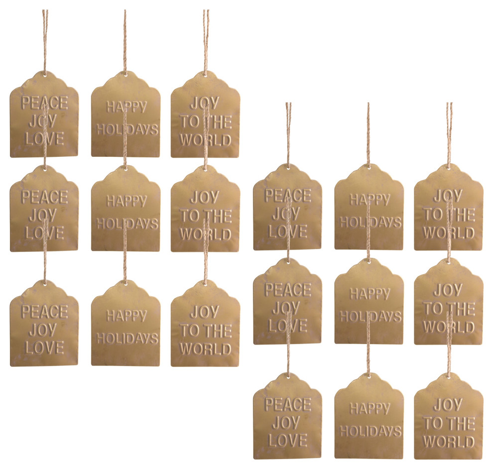 Adorn your Christmas Tree with this beautiful set of Sentiment Tag Ornaments. Featuring three assorted designs and twelve total pieces, the sentiments include "Peace Joy Love", "Happy Holidays", and "Joy to the World". The traditional tag design paired with the quality metal composition makes this piece the perfect addition to your holiday tree decor. They can be used as Christmas gifts for friends to cherish, or you can display the set on your own tree and enjoy them for years to come.