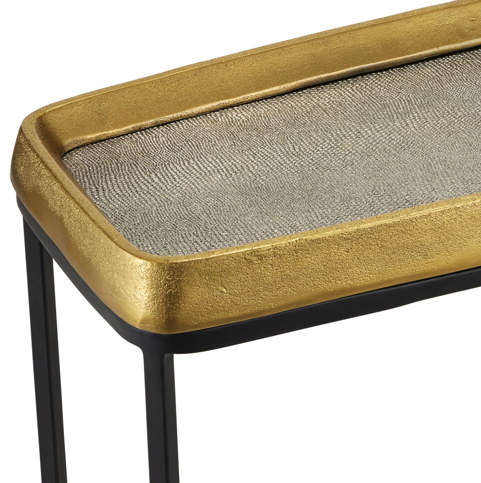 The Tanay Brass Console Table is not shy when it comes to infusing a space with an incredible mix of textures. Not only does the cast aluminum top have tell-tale pitting on the surfaces of its gleaming gold interior and exterior edge, the bottom of its tabletop is stamped in a snakeskin pattern in a graphite finish. This masterpiece of artistry sits atop a black iron base that is minimal to allow the artisanal top to be the scene-stealer.