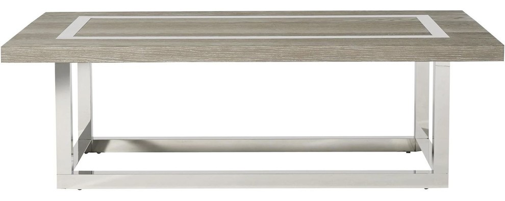 Introduce a breezy elegance to living spaces with the Wyatt Cocktail Table, crafted with a neutral Flint-finished wooden top and brightened by stainless steel accents.