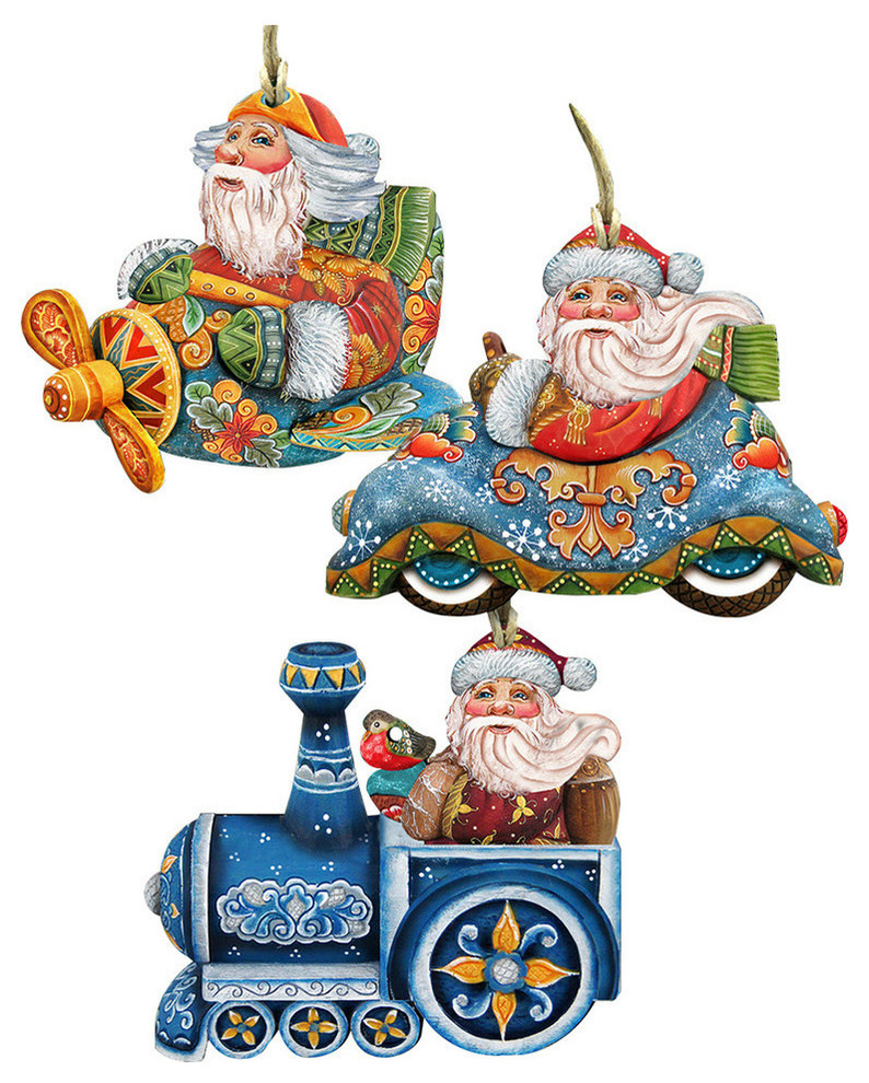 Celebrate Christmas with this Voyage Santa Ornaments Set of Three. This masterfully handcrafted scenic ornament created from the best quality Baltic plywood. Inspired by the well renowned G. DeBrekht Artistic Studios our ornaments cultivates detailed Classic Christmas art, winter wonderlands and traveling adventures. Create a memorable holiday art gallery for your family and friends to enjoy. These beautifully handcrafted Wooden Decorative Ornaments make for a great gift for any occasion. Great for home, garden and holiday decorating. Can be used Indoors or Outdoors. Arrive ready to decorate your home with! Multiuse Item, great for DIY Projects and Ideas. Overall ornament size : 5" x 5" x 0.25" - flat ornament Size:5.5 x 5 x 1/4 Catalog#7-KEEPSAKE WOOD ORN-Ornaments & Tree Decor